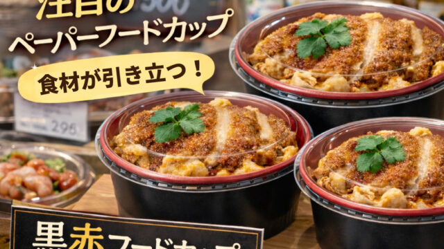 【和食メニューに映える】黒×赤のフードカップでテイクアウトを格上げ!こんにちは。丼ものや麺メニューのテイクアウトで、こんなお悩みはありませんか?👉 和食がもっと美味しそうに見える容器が欲しいそんな方におすすめなのが、外黒×内赤のペーパーフー...