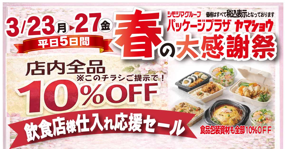 パッケージプラザヤマショウでは、春の大感謝祭を開催中です。